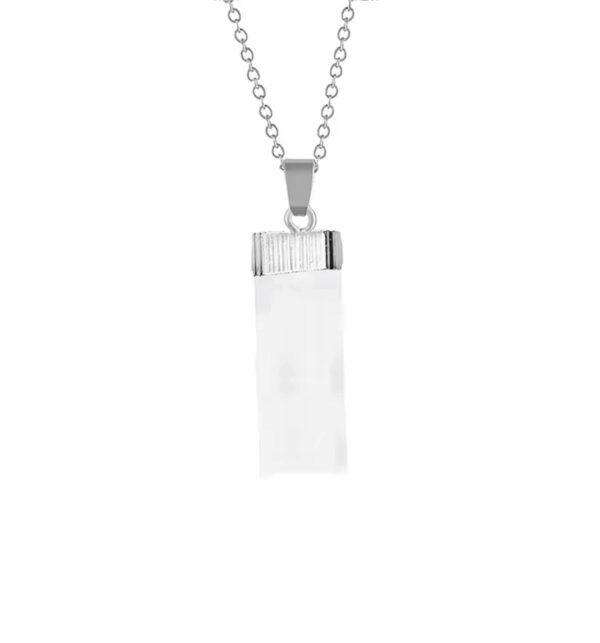 Peça de Selenite natural com chapeamento prateado e corrente de aço inox prateada.